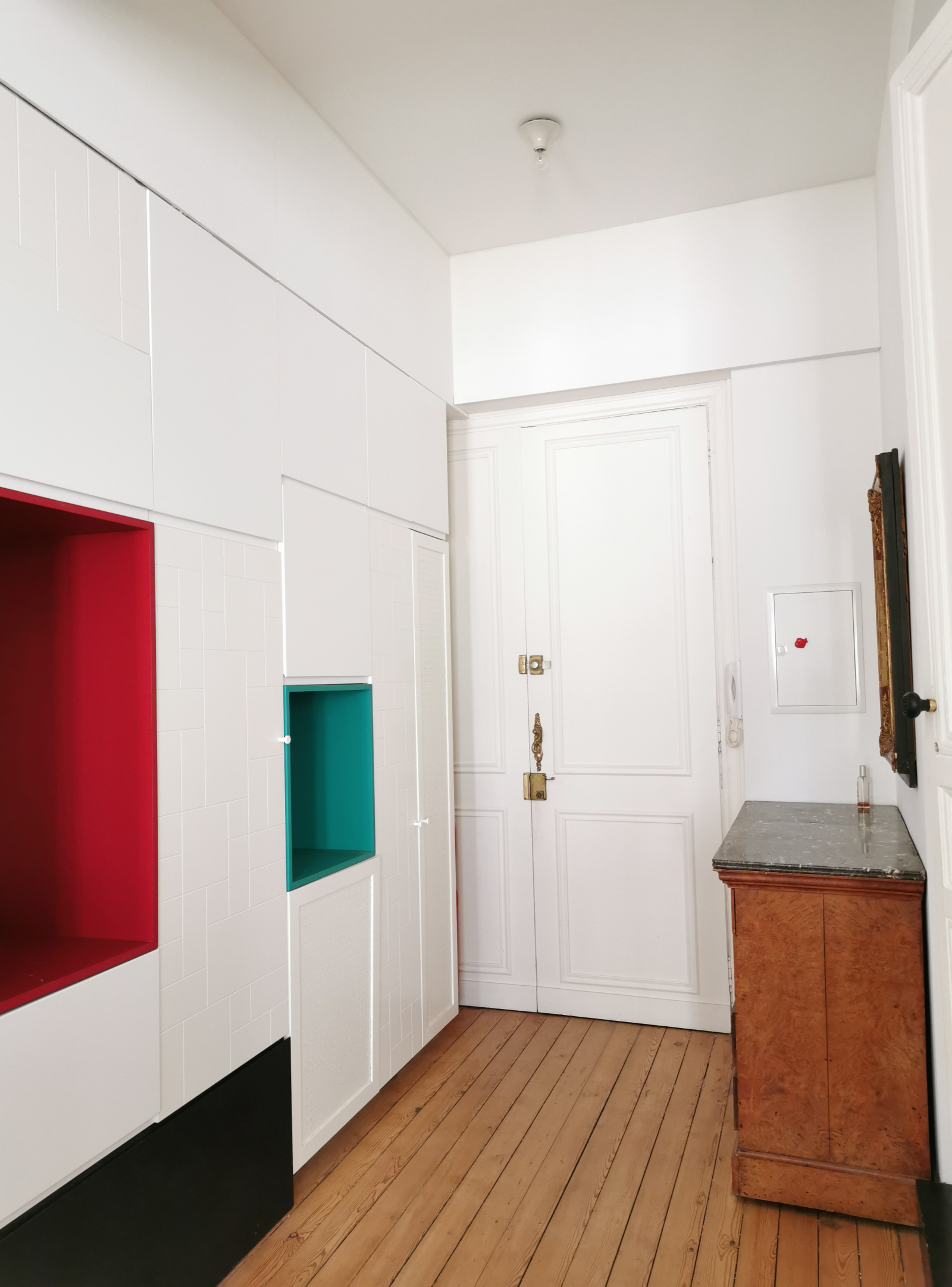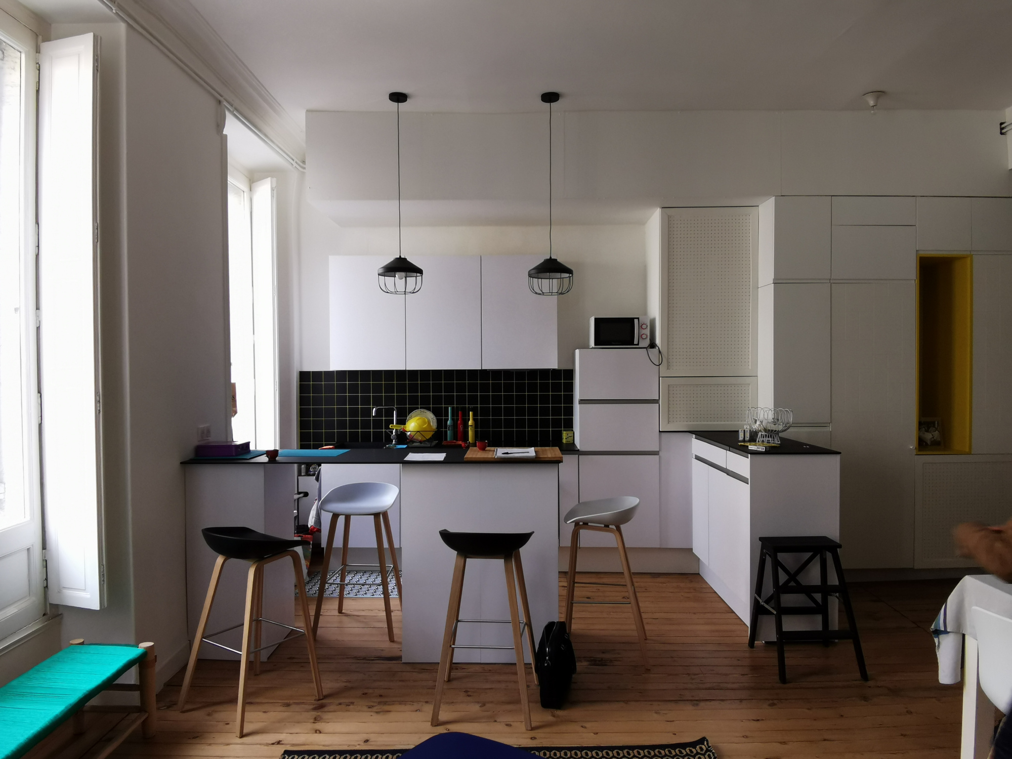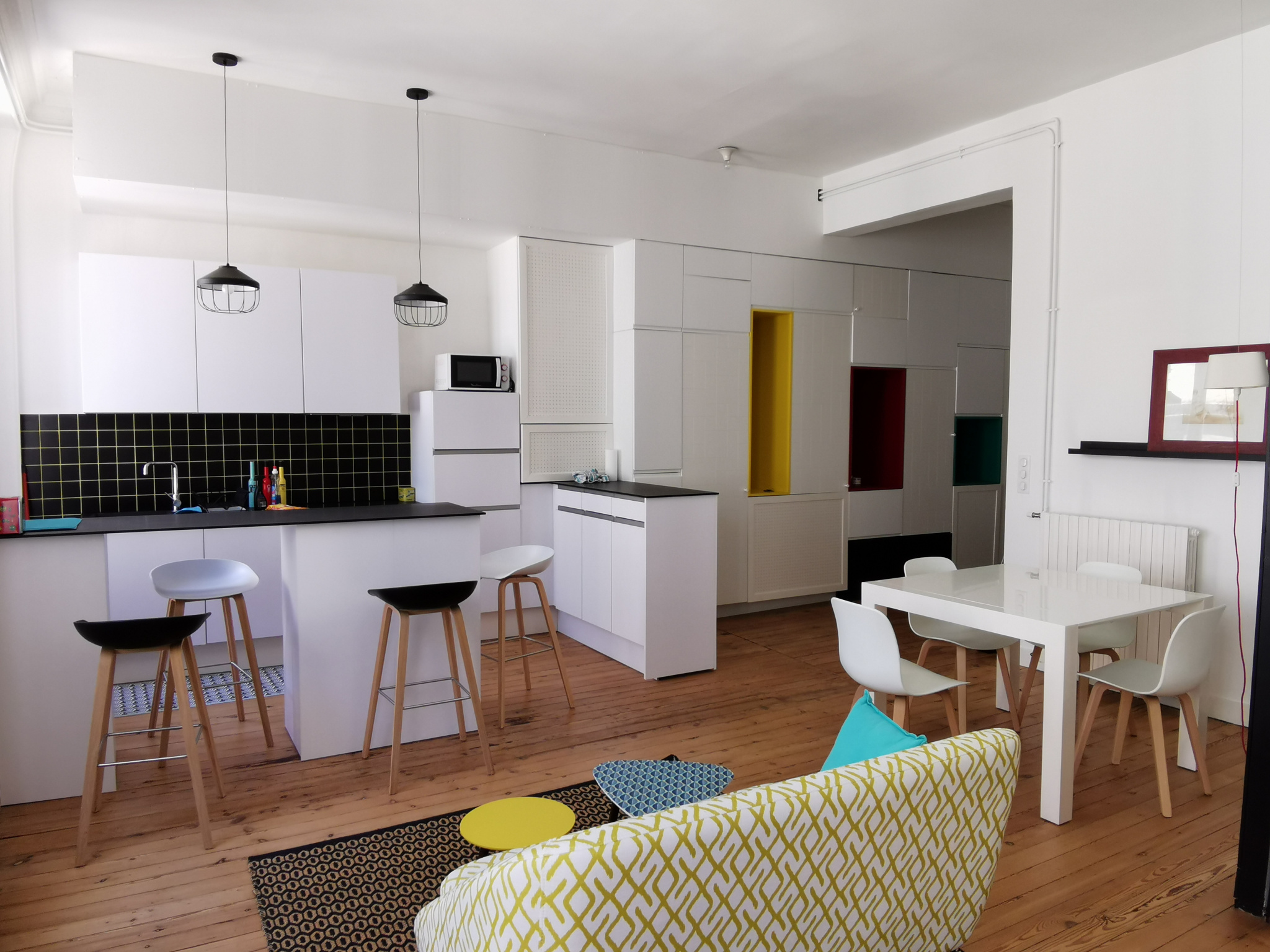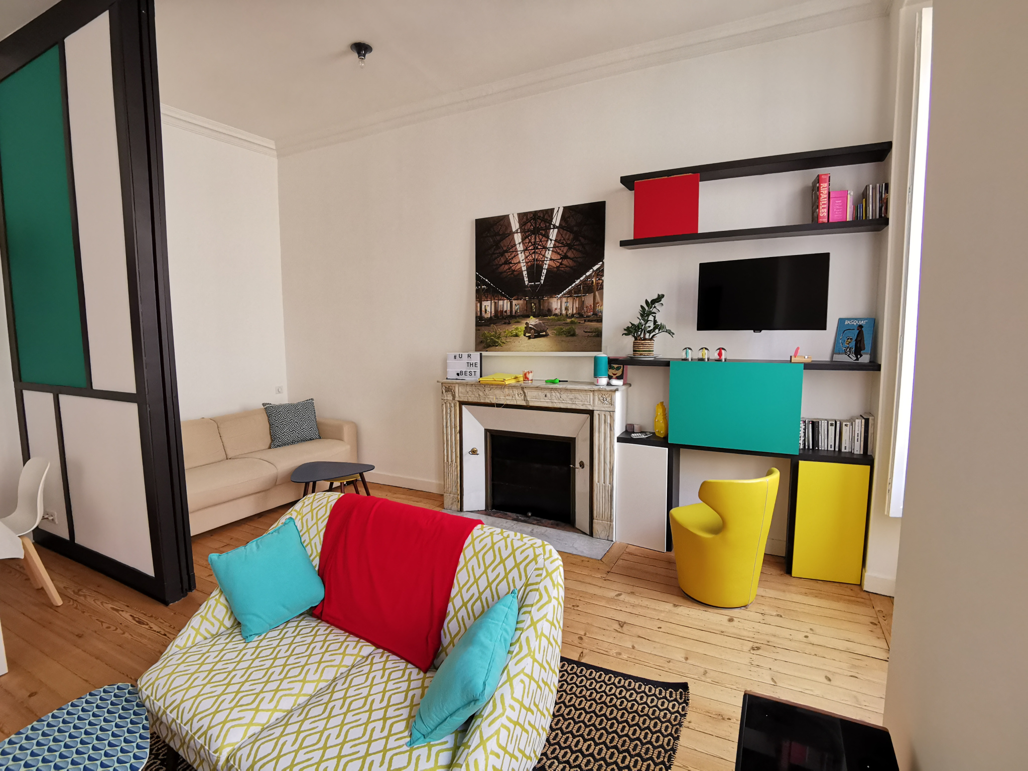 L'appartement comprend entrée, séjour avec cuisine américaine équipée et espace nuit/bureau séparé par cloison mobile, chambre avec salle d'eau, WC séparé.
